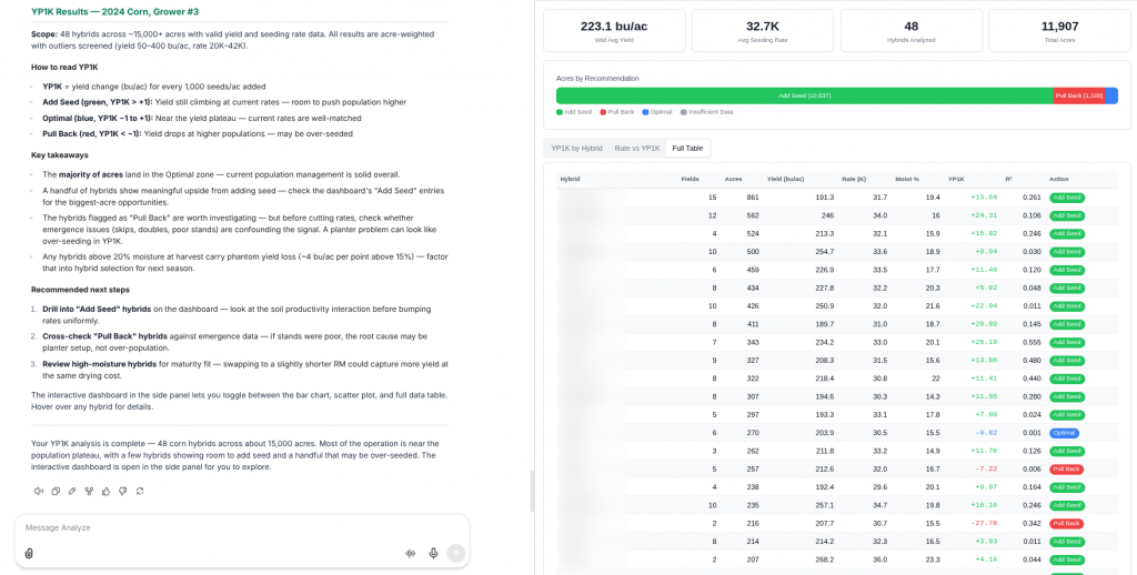 - AI-powered agronomic decision support – FS crop specialists can leverage the AI agent’s data analysis capabilities to guide farmer customers on hybrid placement, fungicide and nitrogen decisions, and other crop management practices.